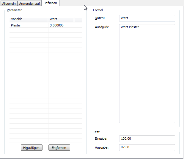Wenn Sie z. B. einen Abzug für Putz von 3 % erstellen möchten und eine Variable namens "Abzug_Putz" mit einem Wert von 0.97 definiert haben, geben Sie FlächenWert * Abzug_Putz ein.