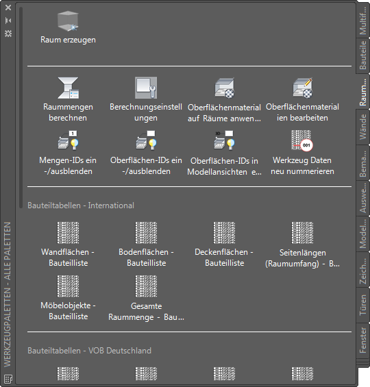 - Symbole für das Einfügen von Bauteiltabellen für die anderen Raummengen (Wände, Geschossdecken, Deckenflächen, Umfang und Möbelobjekte) - je nach dem aktuellen Berechnungsstandard