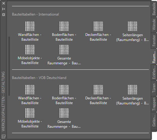 Die Werkzeugpalette Raumbuch enthält je nach aktuellem Berechnungsstandard unterschiedliche Bauteiltabellen. Die Befehle sind mit der Datei