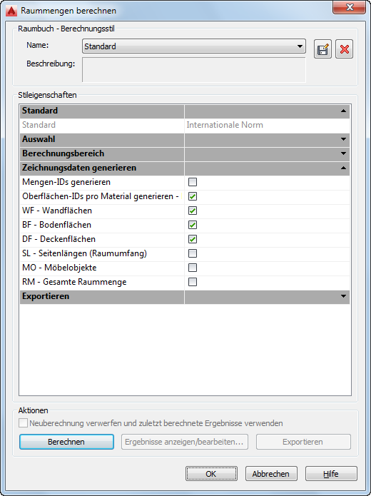 - Wählen Sie im Dialogfeld Raummengen berechnen unter Stileigenschaften in der Liste Zeichnungsdaten generieren die Option Oberflächen-IDs pro Material generieren aus.