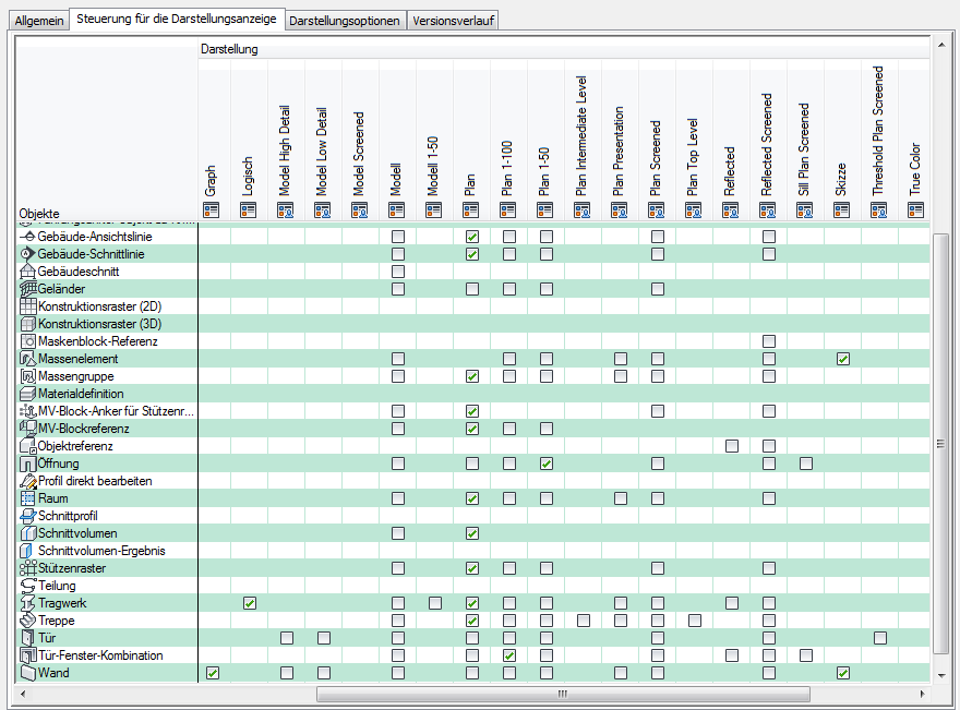 Im rechten Fensterausschnitt befindet sich eine Matrix, in der jedes Objekt und jede Darstellung aufgeführt wird. Ein Häkchen unterhalb einer Darstellung zeigt an, dass der Darstellungssatz diese verwendet, um das entsprechende Objekt anzuzeigen. In dem Modelldarstellungssatz verwenden beispielsweise die meisten Objekte die Modelldarstellungen.