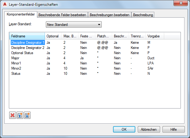 Mit jedem Layer-Standard wird eine Reihe von Komponentenfeldern definiert, über die der Layer-Name und die Regeln für die Inhalte jedes Feldes gesteuert werden können. Wenn Sie einen Layer-Standard erstellen bzw. bearbeiten, greifen Sie auf die Layer-Standard-Eigenschaften zu und ändern die Komponentenfelder.