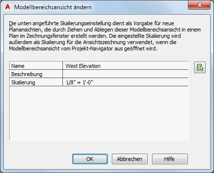 Anmerkung: Zum Ändern des Namens, der Beschreibung oder des Maßstabs einer Modellbereichsansicht muss die zugehörige Ansichtszeichnung nicht geöffnet sein. Wenn Sie die Umgrenzungen des Modellraums ändern möchten, muss die zugehörige Ansichtszeichnung geöffnet sein.