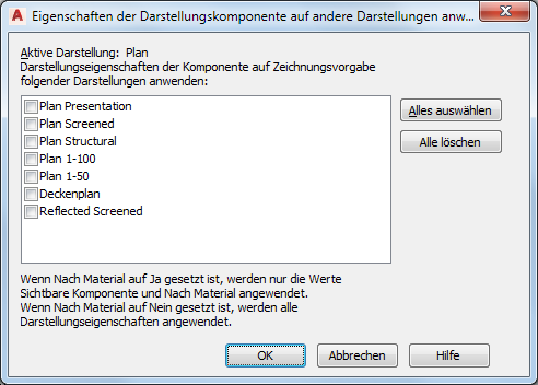 Anmerkung: Wenn für Nach Material die Einstellung Ja ausgewählt ist, werden nur diese Einstellung und die Einstellung für Sichtbar auf die ausgewählte Darstellung angewendet. Wenn für Nach Material die Einstellung Nein ausgewählt ist, werden alle Einstellungen für die Darstellungseigenschaften der Komponente auf die ausgewählten Darstellungen angewendet.