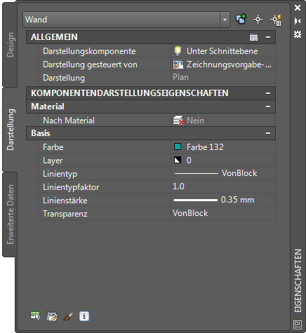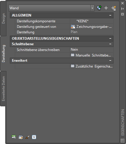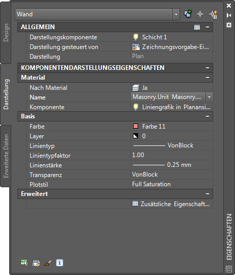 Sie können die Registerkarte Darstellung der Eigenschaftenpalette verwenden, um die Einstellungen der Darstellungseigenschaften für ein ausgewähltes Objekt in der aktuellen Darstellung zu ändern. Sie können Einstellungen für Eigenschaften ändern, die das gesamte Objekt betreffen (wie die Schnittebenenhöhe), sowie Einstellungen für die einzelnen Darstellungskomponenten des Objekts (wie Farbe, Layer und Linientyp für eine Schraffurkomponente).