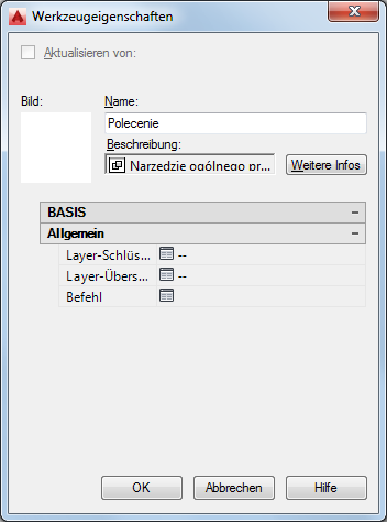 Standardmäßig ist dem Befehlswerkzeug kein Bild zugeordnet. Um ein Bild zur Veranschaulichung der Werkzeugfunktion hinzuzufügen, klicken Sie mit der rechten Maustaste auf die leere für das Bild vorgesehene Fläche und wählen ein Bild aus. |
