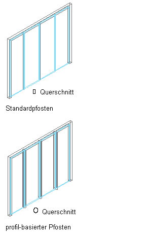 Sämtliche Tür-Fenster-Kombinationsraster einschließlich des Primärrasters können Pfostendefinitionen aufweisen. Die Pfosten einer Tür-Fenster-Kombination sind die Kanten zwischen den Rasterzellen. Sie können Pfosten definieren, indem Sie eine Breite und Tiefe angeben oder ein Profil auswählen, über den der Pfosten extrudiert wird.