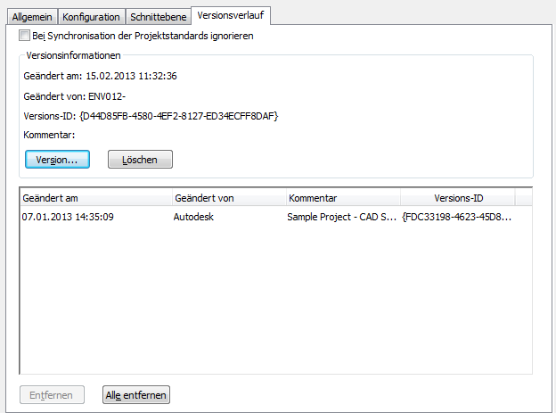 - Zum Entfernen einer bestehenden Version wählen Sie diese in der Liste Versionsverlauf aus und klicken auf Entfernen.