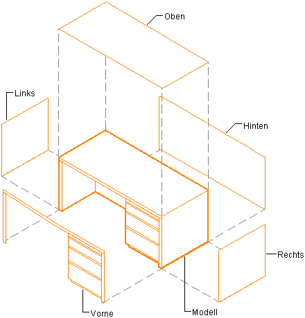 Wenn Sie beispielsweise den Einfüge-Basispunkt des Modell-Ansichtblocks als Mittelpunkt der unteren Kante auf der Rückseite angeben, liegt der Einfüge-Basispunkt der vorderen und hinteren Ansichtsblöcke am Mittelpunkt der unteren Kante. Dann liegt der Einfüge-Basispunkt der linken und rechten Ansichtsblöcke an der hinteren unteren Ecke und der Einfüge-Basispunkt der oberen und unteren Ansichtsblöcke am Mittelpunkt der hinteren Kante.
