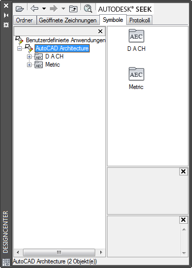 Zusätzlich zu den Symbolen stehen auch andere Typen von vordefinierten Inhalten zur Verfügung, etwa Layer, Vorlagen und Materialien. Diesen Inhalt finden Sie unter C:\ProgramData\Autodesk\ACA <Version>\deu.