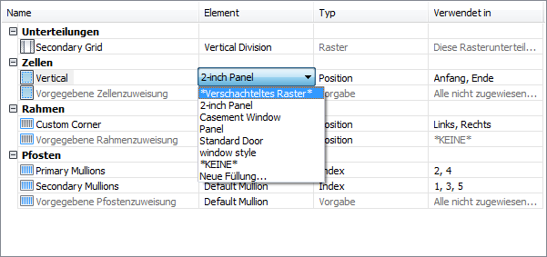 Gehen Sie wie folgt vor, um ein verschachteltes Raster in einer Fassade zu erstellen. Ein verschachteltes Raster ist ein Raster innerhalb eines Rasters. Für jedes Raster gibt es eine eigene Unterteilung, eigene Zellzuweisungen, einen eigenen Rahmen und eigene Pfosten. Vorgabemäßig ist der Rahmen für verschachtelte Raster deaktiviert.