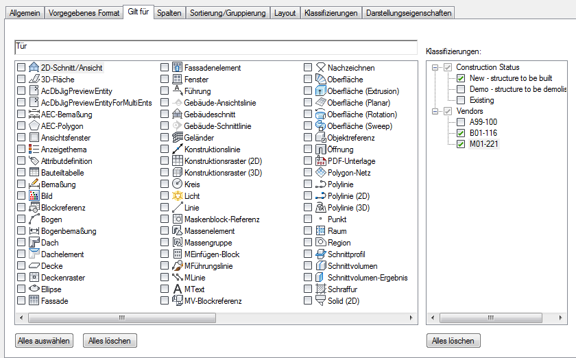 Alle Klassifizierungsdefinitionen, die auf dasselbe Objekt angewendet werden, für die die Eigenschaftssatz-Definition gilt, werden auf der rechten Seite mit einer Liste ihrer zugehörigen Klassifizierungen dargestellt. Wenn Klassifizierungen gewählt werden, kann die Eigenschaftssatz-Definition nur auf solche Objekte oder Stile sowie auf der linken Seite gewählte Definitionen angewendet werden, die über alle ausgewählten Klassifizierungen der rechten Seite verfügen.
