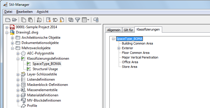 Die ersten drei Argumente sind normalerweise in allen Fällen identisch. Das erste Argument ist die Datenbank, auf die der Klassifizierungssatz angewendet werden muss. Das zweite Argument ist die aktuelle Assembly, die das Standard-Plug-In implementiert. Das dritte Argument ist die Lokalisierung, für die die Klassifizierungen eingerichtet werden sollen. (In diesem Beispiel wird die aktuelle Einstellung von AutoCAD Architecture toolset verwendet. Dies ist die empfohlene Vorgehensweise.) Das vierte Argument ist der Name der String-Tabelle innerhalb der Ressourcen der Assembly. Das letzte Argument definiert einen Namen für den Klassifizierungssatz in AutoCAD Architecture toolset. Dieser sollte ebenfalls lokalisiert werden, da er für den Benutzer sichtbar ist. In diesem Abschnitt wird jedoch nur die Behandlung der Klassifizierung beschrieben. Wenn Sie den Standard ausführen und die Ressourcendatei richtig eingerichtet ist, enthält die Zeichnung nun Klassifizierungsdefinitionen, die nur auf Räume angewendet werden, deren Namen in der String-Tabelle der Ressourcen definiert sind, wenn der Standard der Zeichnung zugeordnet wird.
