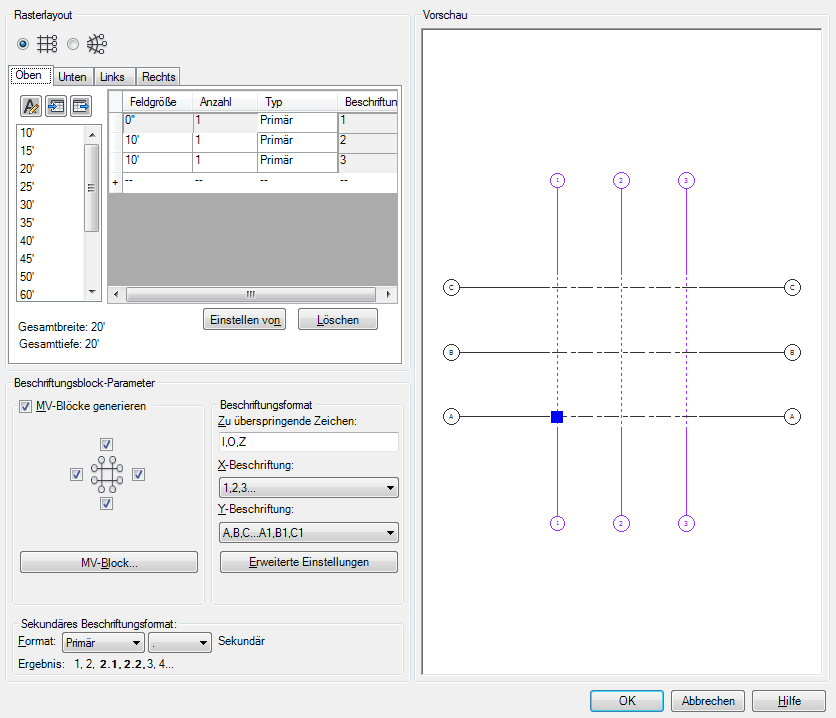 - Werden nachfolgende Rasterlinien hinzugefügt, werden die Beschriftungen entsprechend der Formatierung für MV-Blöcke generieren erstellt.