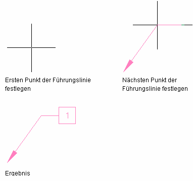 Anmerkung: Diese Anweisungen basieren auf einer der im Lieferumfang der Software enthaltenen Konfigurationen des Beschriftungswerkzeugs. Je nach Anpassung kann möglicherweise das gleiche Werkzeug in der Werkzeugpalette Beschriftung enthalten sein. Jedoch wird die gleiche grundlegende Vorgehensweise bei jeder Konfiguration des Beschriftungswerkzeugs angewendet, bei der der Inhaltstyp den Wert Block, der Führungstyp den Wert Gerade aufweist und die Eigenschaften für Symbol und Symbolposition ein blockbasiertes Symbol angeben, das mit dem Werkzeug aufgerufen werden kann. Die Führungslinieneigenschaften können auf dem Arbeitsblatt Werkzeugeigenschaften des Beschriftungswerkzeugs geändert werden. Bei nicht angegebenen Eigenschaften werden die derzeit in der aktuellen Zeichnung definierten Einstellungen der Führungslinien verwendet, die im Dialogfeld Führungseinstellungen geändert werden können.