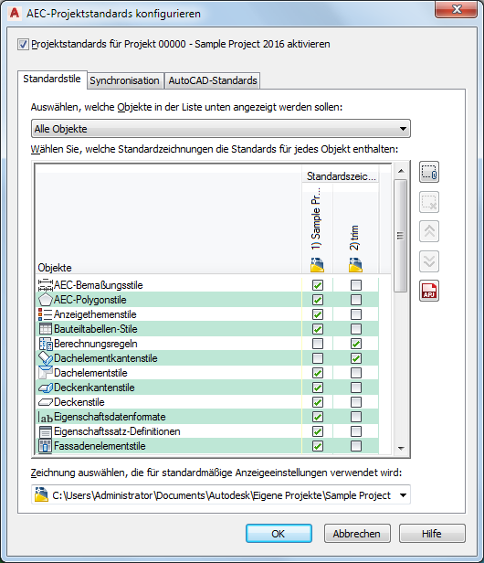 Die Synchronisation der AutoCAD-Standards (DWS) eines Projekts ist ein eigener, von der Synchronisation der AEC-Standards des Projekts unterschiedener Vorgang. Während für die AEC-Standards eines Projekts die automatische Synchronisation beim Öffnen von Zeichnungen vorgegeben werden kann, muss die Synchronisation der AutoCAD-Standards manuell vom Benutzer gestartet werden. Beim Einrichten der AutoCAD-Standards in einem Projekt wird automatisch eine CHX-Datei erstellt. Diese Datei enthält die Projektzeichnungen und die dazugehörigen AutoCAD-Projektstandardszeichnungen. Die CHX-Datei des Projekts kann dann mithilfe der stapelweisen Standardsprüfung geöffnet werden. Anschließend kann das gesamte Projekt im Stapelverfahren geprüft werden.