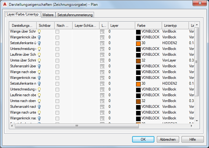 Bei Treppen, die in Versionen von Autodesk Architectural Desktop vor 2004 erstellt wurden, ist die Option Darstellungskonfigurations-Schnittebene überschreiben standardmäßig aktiviert. In der aktuellen Version ist diese Option standardmäßig deaktiviert und die Darstellung der Treppenkomponenten wird automatisch von spezifischen Darstellungskonfigurationen für jede Ebene übernommen.