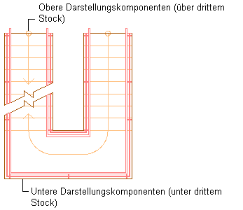 9. Die Darstellungskomponenten nach oben, die über der ersten Ebene liegen, werden ebenso wie die über der Schnittebene liegenden Darstellungskomponenten als Umriss mit einem Strichlinientyp angezeigt.
