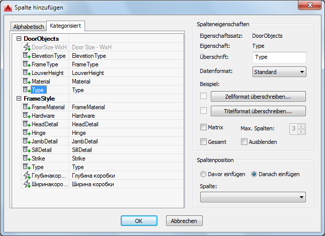 Gehen Sie wie folgt vor, um Spalten für die einzelnen Eigenschaften hinzuzufügen, die in den anhand eines Bauteiltabellen-Stils erstellten Bauteiltabellen aufgeführt werden sollen.