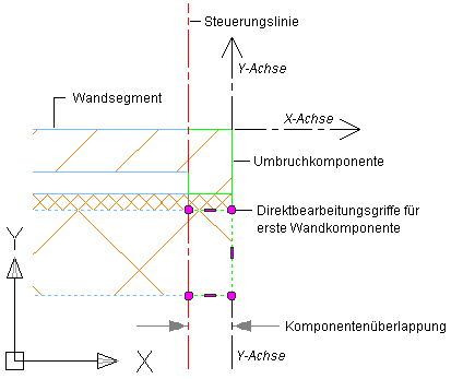 Wahrscheinlich arbeiten Sie oft mit Wandstilen, in denen mehrere Komponenten an einem Wandabschluss oder einer Öffnung vorliegen. Beispielsweise kann der Endabschluss in einigen Wandstilen eine Ziegelmauer umfassen. Ist dies der Fall, stellt eine parallel zur Y-Achse verlaufende Steuerungslinie die innerste Komponentenfläche dar, und die übrigen Komponenten des Wandstils beginnen an dieser Steuerungslinie. Wenn Sie ein Wandsegment auswählen, um eine neue Wandabschlussbedingung für die erste Wandkomponente anzuwenden, werden die Direktbearbeitungsgriffe entlang der Steuerungslinie gezeigt (siehe Abbildung).