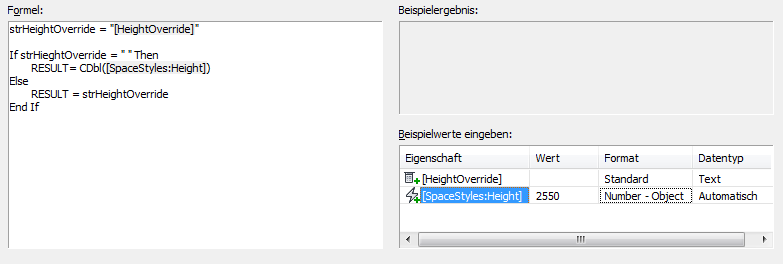 Beispielwerte werden formatiert und in die Formel anstatt der entsprechenden, von Klammern umgebenen Namen der Eigenschaftsdefinition eingefügt. Die gesamte Beispielformel wird geprüft, und das Ergebnis wird im Fenster für Beispielergebnisse angezeigt.