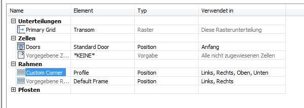 Nachdem Sie Elementdefinitionen für einen Tür-Fenster-Kombinationsstil erstellt haben, können Sie diese Definitionen den verschiedenen Elementtypen für Tür-Fenster-Kombinationen zuweisen: Unterteilungen, Zellenfüllungen, Rahmen und Pfosten.