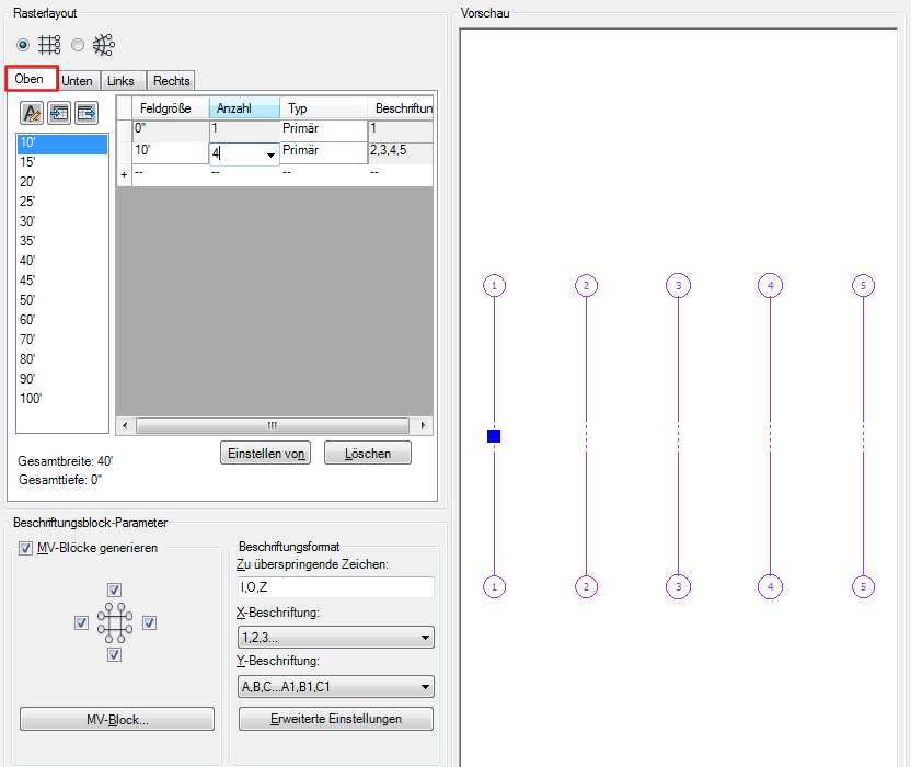 Nun überspannt das erste Feld unten zwei Felder, und Sie haben statt fünf Rasterlinien nur vier. Sie können nun entweder zur Registerkarte Links wechseln, um die Rasterachse zu bearbeiten, oder Sie drücken die EINGABETASTE, um das Raster in der Zeichnung zu platzieren.