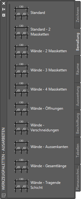 Die im Arbeitsbereich vorgegebenen Werkzeugpaletten enthalten Beispiel-AEC-Bemaßungswerkzeuge, die Sie Ihren Anforderungen entsprechend verwenden und anpassen können. Darüber hinaus enthalten die nachstehenden in der Software integrierten Kataloge AEC-Bemaßungswerkzeuge, die Sie Ihren Werkzeugpaletten hinzufügen können: