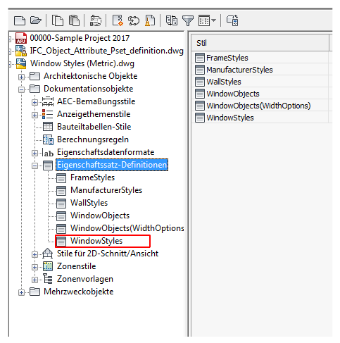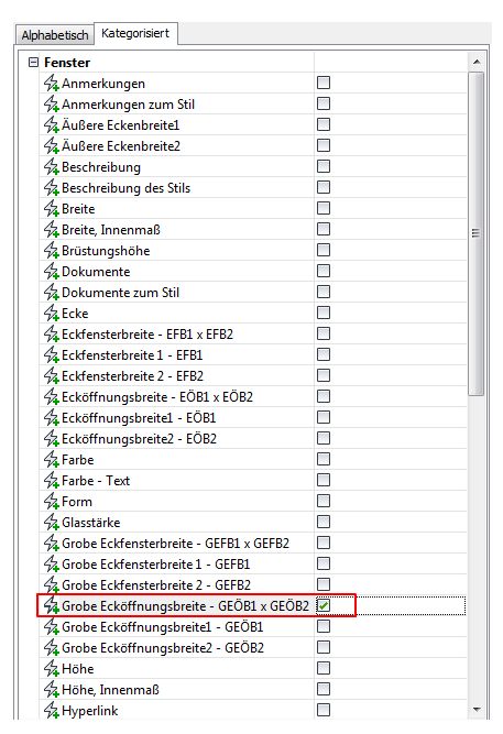 Gehen Sie folgendermaßen vor, um die automatischen Eigenschaften in der Fensterbauteilliste zu ändern: