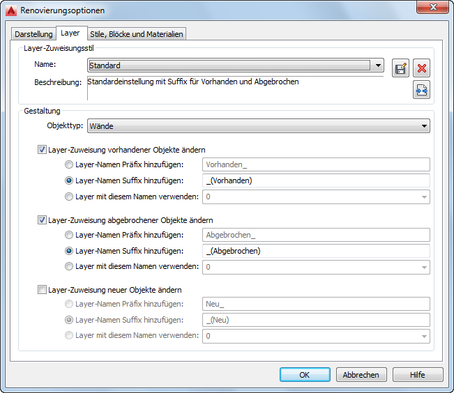 Ändern Sie die Gestaltung der Renovierung, um Layer für Objekte basierend auf ihrem Objekttyp und der Renovierungskategorie umzubenennen oder neu zuzuweisen. Diese Änderungen werden in der aktuellen Zeichnung gespeichert.