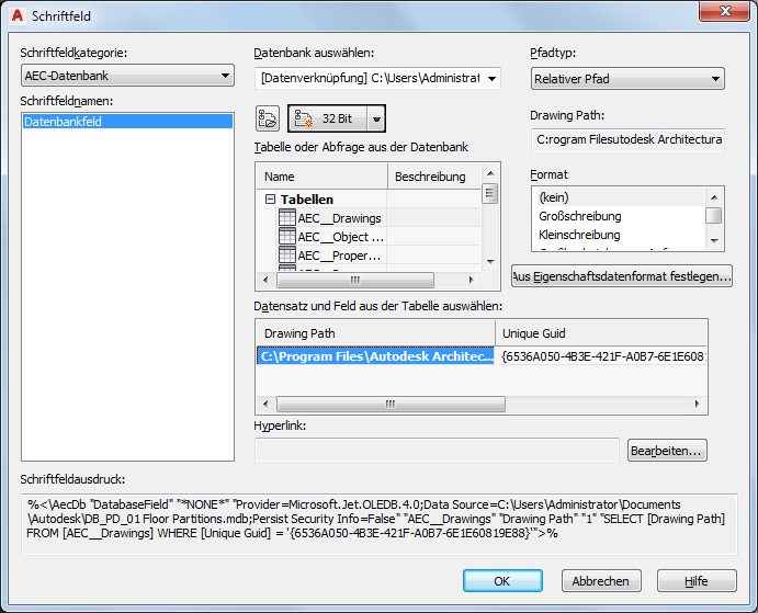 Gehen Sie wie folgt vor, um ein in eine Zeichnung einzufügendes Datenbankfeld auszuwählen.