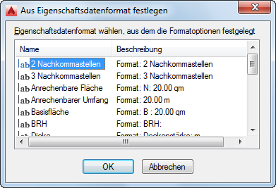 Die Einstellungen des ausgewählten Eigenschaftsdatenformats werden in die Formatierungscodes im Feld kopiert.