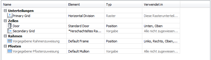 Sie können in der Registerkarte Gestaltung des Dialogfelds Eigenschaften für Fassadenstil verschachtelte Raster definieren. Die Raster werden im linken Fensterausschnitt in einer Baumstruktur aufgeführt. Es gibt immer ein Primärraster. Das Primärraster kann ein oder mehrere Sekundärraster haben. Jedes sekundäre Raster kann ein oder mehrere Tertiärraster haben, usw.