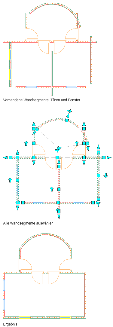 Beim Verschneiden von mehreren Wandverschneidungen werden überstehende Wände auf die als Umgrenzung dienenden angrenzenden Wände gestutzt oder erweitert. Nur ausgewählte Wandsegmente sind in der Verschneidung enthalten.