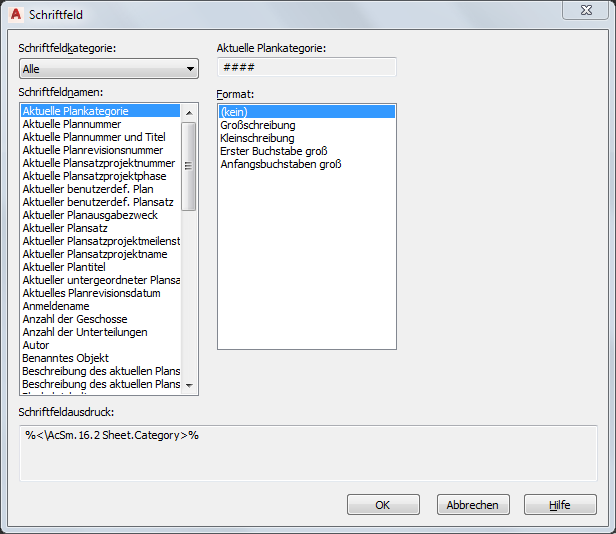 | Datum/Uhrzeit, Dokument, Hyperlink, Objekt, Systemvariable, Diesel-Ausdruck oder Plotfeld | Siehe "Verwenden von Schriftfeldern in Text" in derAutoCAD-Hilfe. |