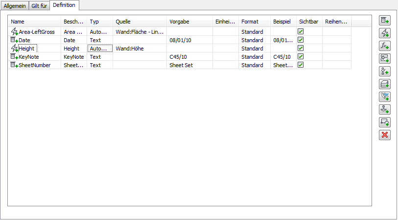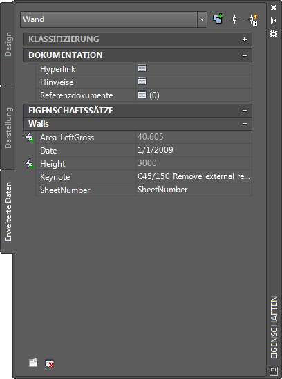 Eigenschaften einer Wand mit Feldern für Bauelementschlüssel, Datum und Plannummer