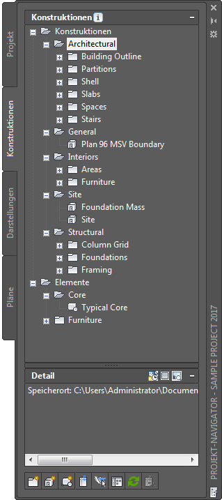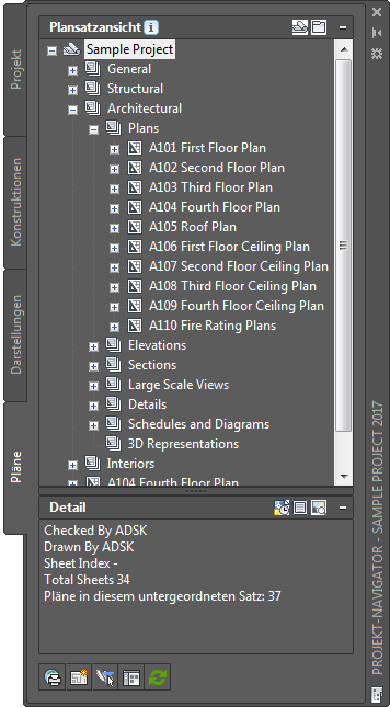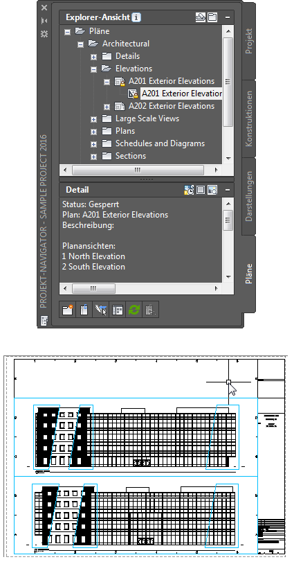 Plansatz, Pläne, Planansichten, Planzeichnungen und Modellbereichsansichten werden auf den Registerkarten Pläne und Ansichten des Projekt-Navigators aufgelistet.