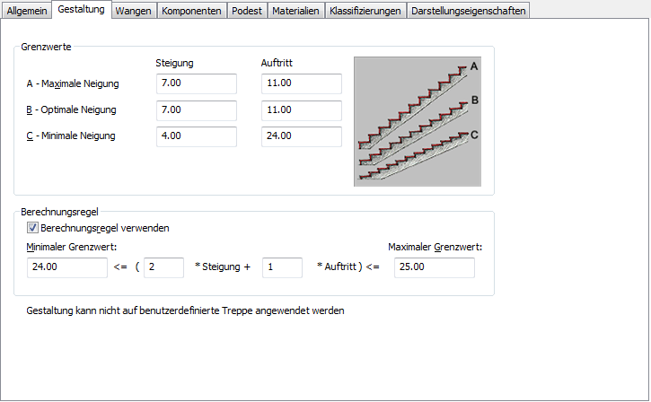 Gehen Sie wie folgt vor, um die minimalen, maximalen und optimalen Grenzwerte für die Steigungshöhe und Auftrittsbreite sowie die Regeln zum Berechnen der Treppe festlegen.