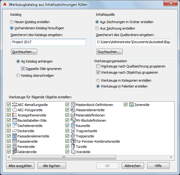 Dadurch wird der gesamte Katalog gelöscht und durch die Paletten, Kategorien und Werkzeuge aus den Quellzeichnungen ersetzt.