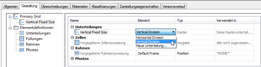 Gehen Sie wie folgt vor, um eine Unterteilung einem Fassadenelementraster zuzuordnen. Eine Unterteilung definiert die Rasterausrichtung (ob die Richtung der Rasterzellen und Pfosten horizontal oder vertikal ist) sowie den Unterteilungstyp (Zellenanzahl und -größe).