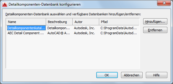 Gehen Sie wie folgt vor, um eine neue Datenbank der Liste der aktiven Detailkomponenten-Datenbanken hinzuzufügen, aus denen die Komponenten eingefügt, in eine Werkzeugpalette kopiert oder zum Ändern eines vorhandenen Werkzeugs verwendet werden können.