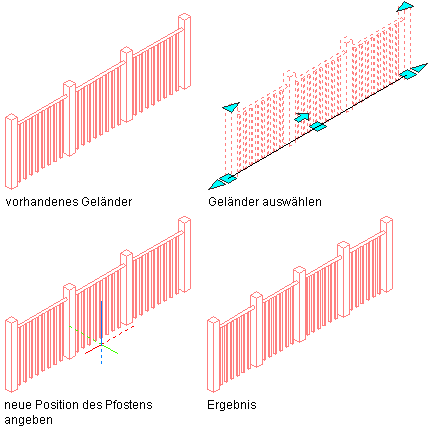 Gehen Sie wie folgt vor, um einem Geländer Pfosten hinzuzufügen. Der Pfosten wird an dem auf dem Geländer ausgewählten Punkt positioniert.