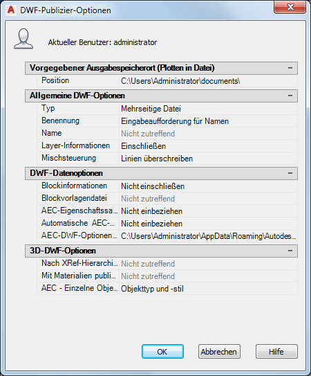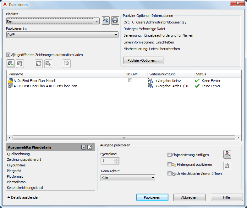 Sie können angeben, dass Zeichnungen beim Speichern oder Schließen automatisch im PDF-Format (oder DWF- bzw. DWFx-Format) veröffentlicht werden. Beim Festlegen der Einstellungen für das automatische Publizieren können Sie außerdem angeben, ob Modelle, Layouts oder beides eingeschlossen werden und ob eine ein- oder mehrseitige Datei publiziert wird.