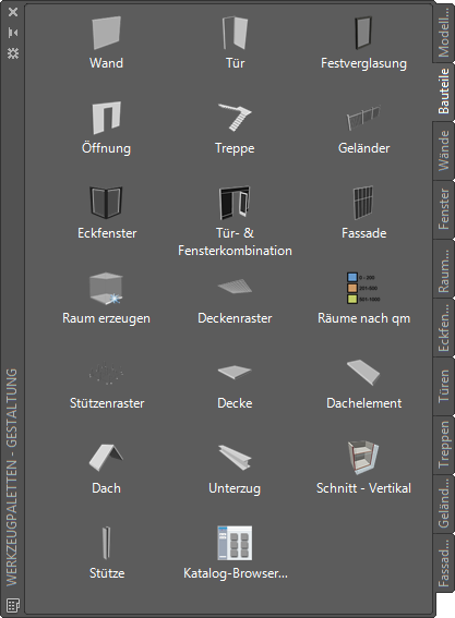 Die Werkzeuge in AutoCAD Architecture toolset gliedern sich in drei Kategorien.