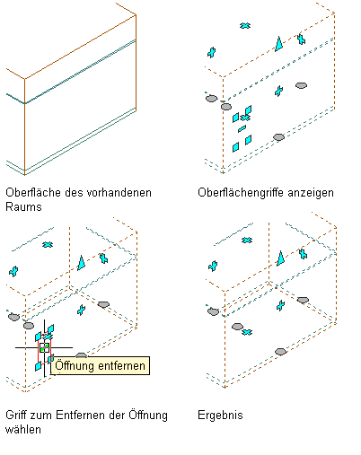 - Wählen Sie den Raum aus, aus dem Sie eine Oberflächenöffnung entfernen möchten, und lassen Sie auf eine der folgenden Arten die Griffe für die Oberflächenöffnungen anzeigen: