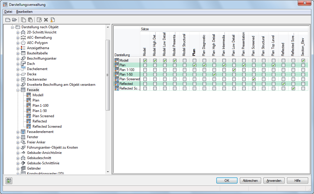 Im rechten Fensterausschnitt werden in den Zeilen die Darstellungen aufgeführt, die für dieses Objekt vorhanden sind, und in den Spalten die Darstellungssätze. Ein Häkchen unterhalb eines Darstellungssatzes zeigt an, dass die Darstellung in diesem Darstellungssatz verwendet wird. Eine Darstellung kann in mehreren Darstellungssätzen verwendet werden.