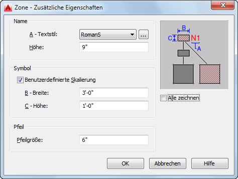 Anmerkung: Um die Änderungen auf alle Zonen in der Zeichnung anzuwenden, wählen Sie Zeichnungsvorgabe-Einstellung. Um die Änderungen auf alle Zonen mit diesem Stil anzuwenden, wählen Sie Zonenstil: <Stilname>.