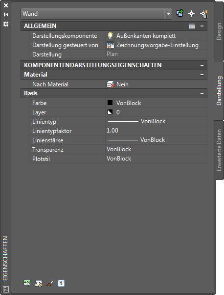 Während Sie die physischen Eigenschaften eines Objekts über die Registerkarte Design der Eigenschaftenpalette steuern können, werden die grafischen Eigenschaften über die Registerkarte Darstellung festgelegt, indem Sie die Einstellungen für die einzelnen Darstellungskomponenten wie Umgrenzungen und Schraffuren auswählen. Die auf dieser Registerkarte vorgenommenen Änderungen sind sofort in der aktuellen Darstellung wie Plan oder Modell sichtbar und können auch auf andere Darstellungen angewendet werden. Während die Einstellungen auf der Registerkarte Design nur für das bzw. die aktuell ausgewählte(n) Objekt(e) gelten, können Sie auf der Registerkarte Darstellung angeben, ob eine geänderte Eigenschaft für die ausgewählte Komponente auf alle Objekte dieses Typs, alle Objekte mit diesem Stil oder nur auf das ausgewählte Objekt angewendet werden soll. Wenn die Darstellungskomponente durch das Material gesteuert wird, werden die Änderungen auf alle Objekte mit diesem Material angewendet.