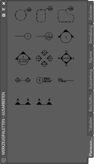 Ein Symbolwerkzeug für Innenansichten mit vier Richtungen im Format N/S/O/W. Die Ansichtssymbole haben einen Feldplatzhalter für die Plannummer, der aufgelöst wird, wenn die Ansichten in einen Plan eingefügt werden. |