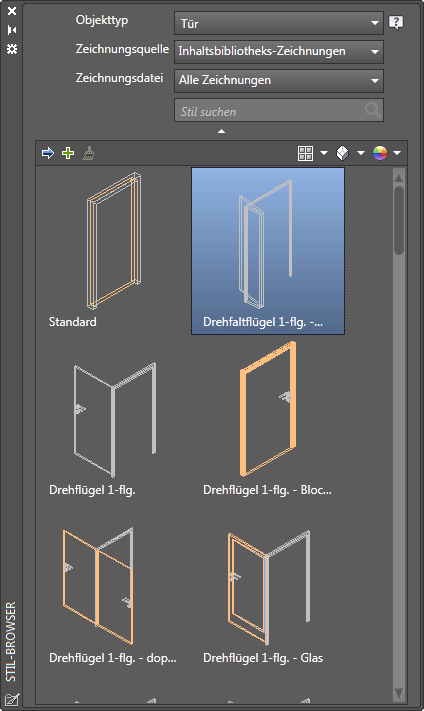 Sie können anhand des Namens nach einem Objektstil suchen, ein Objekt auswählen und die hierfür verfügbaren Stile anzeigen, nach Stilen in der aktuell geöffneten Zeichnung, in den Vorgabezeichnungen des Projekts und in der Inhaltsbibliothek sowie in anderen Zeichnungsdateien suchen.